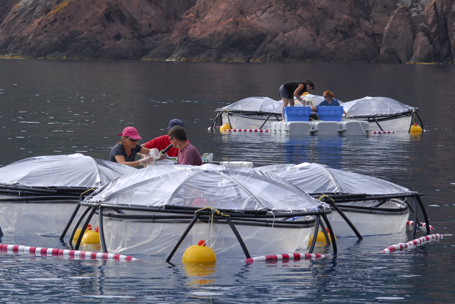 la baie d'Elbo, dans la réserve de Scandola en Corse. Quatre mésocosmes