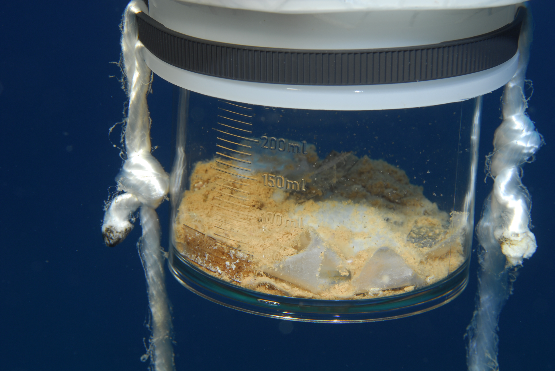 | Description | : | Deux mésocosmes vus de la surface pendant la phase pilote en juillet 2007. L'échantillonnage à 3 profondeurs différentes (subsurface, 5 mètres et 10 mètres) se fait par pompage par l'extérieur sans aucune perturbation de l'intérieur du sac. Un piège à particule est placé à l'extrémité du sac à 14 mètres de la surface. |